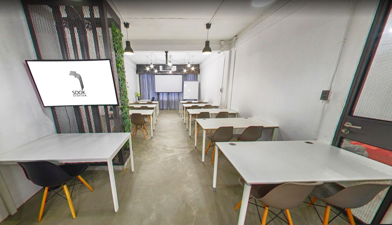 ภายในห้องตกแต่งด้วยโต๊ะไม้พร้อมใช้งาน ทั้งงานเวิร์คช็อป สัมมนา การสอนพิเศษ ประชุมงาน หรือพบปะสังสรรค์กันเป็นกลุ่มใหญ่ และมีบริการโปรเจคเตอร์/ทีวี บรรยากาศเป็นกันเอง โปร่ง สะอาด มีแสงธรรมชาติเข้าถึง